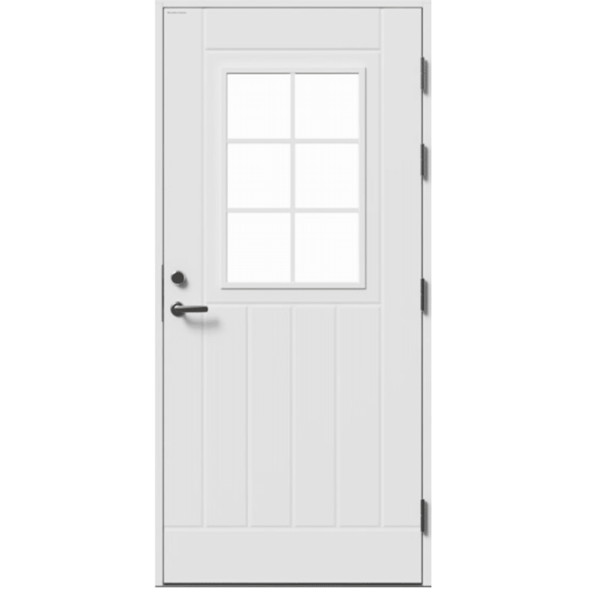 Skansen-døren leveres med 2 metallplater i dørbladet, 42 x 105 mm karm på våre Premium-dører, og 53 x 115 mm karm på våre Passiv-dører, og rustfrie hengsler slik at døren har god stabilitet og holdbarhet under de fleste forhold.