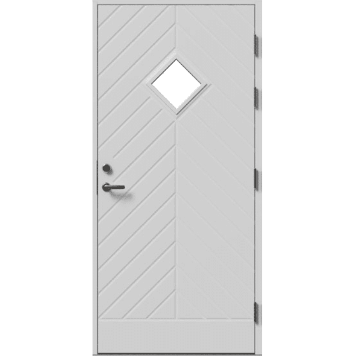 Skansen-døren er bygget med høykvalitetsmaterialer og har robust konstruksjon, inkludert 2 metallplater i dørbladet, som gir ekstra styrke og beskyttelse mot inntrengning.