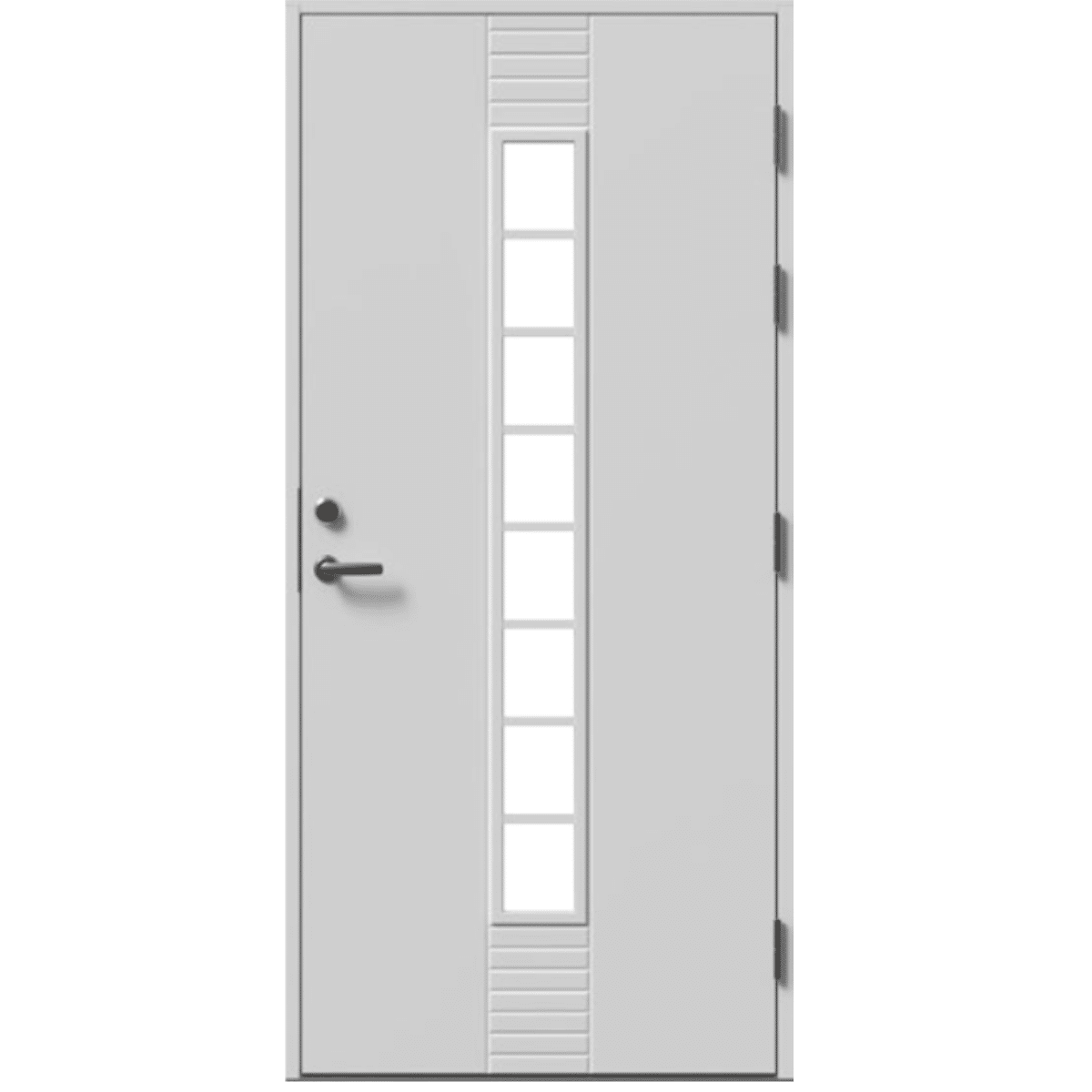 Skansen-døren leveres med 2 metallplater i dørbladet, 42 x 105 mm karm på våre Premium-dører, og 53 x 115 mm karm på våre Passiv-dører, og rustfrie hengsler slik at døren har god stabilitet og holdbarhet under de fleste forhold.