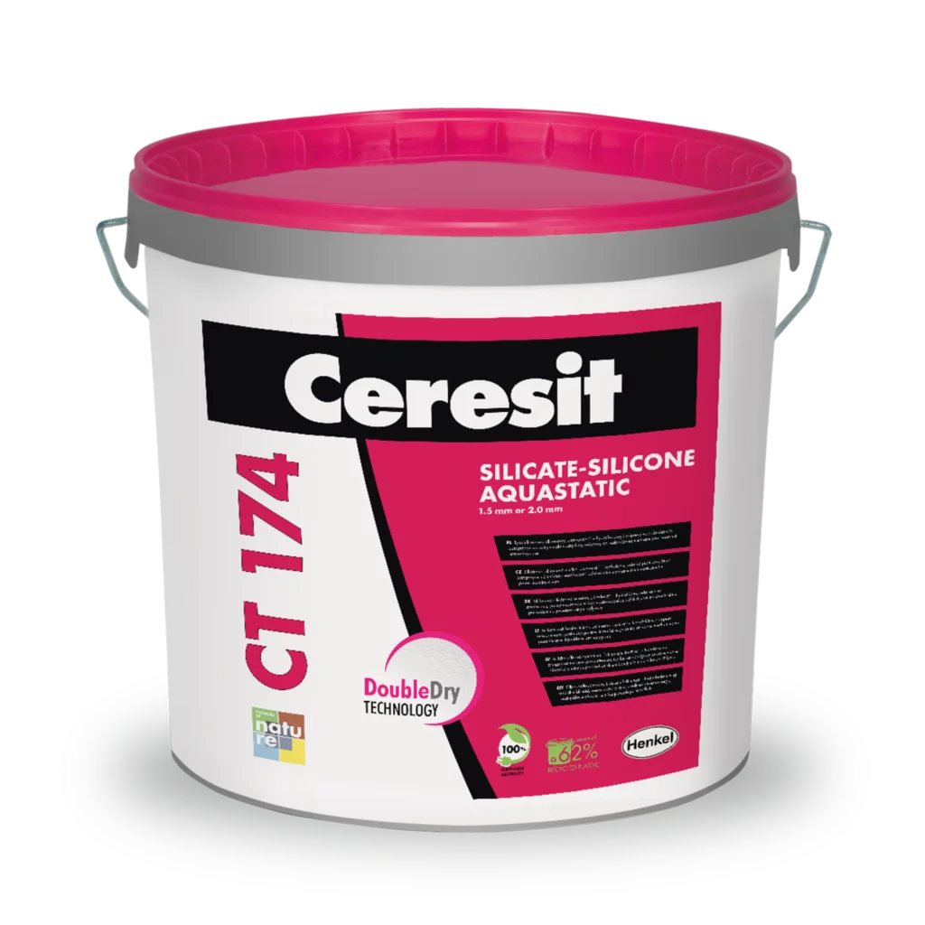 CERESIT® CT 174 kombinerer gode egenskaper fra silikatpuss og silikonpuss. Den er dampgjennomtrengelig, har lav absorpsjonsevne og er smussbestandig. CERESIT CT 174 brukes til å legge tynne pusslag på betongunderlag, tradisjonell puss, gips og sponplater. Det anbefales å bruke CERESIT CT 174 som fasadepuss ved etterisolering av utvendige fasader i systemet CERESIT Ceretherm ETICS med bruk av EPS-plater. Den er beskyttet mot biologisk nedbrytning. Leveres i spann a’ 25 kg.