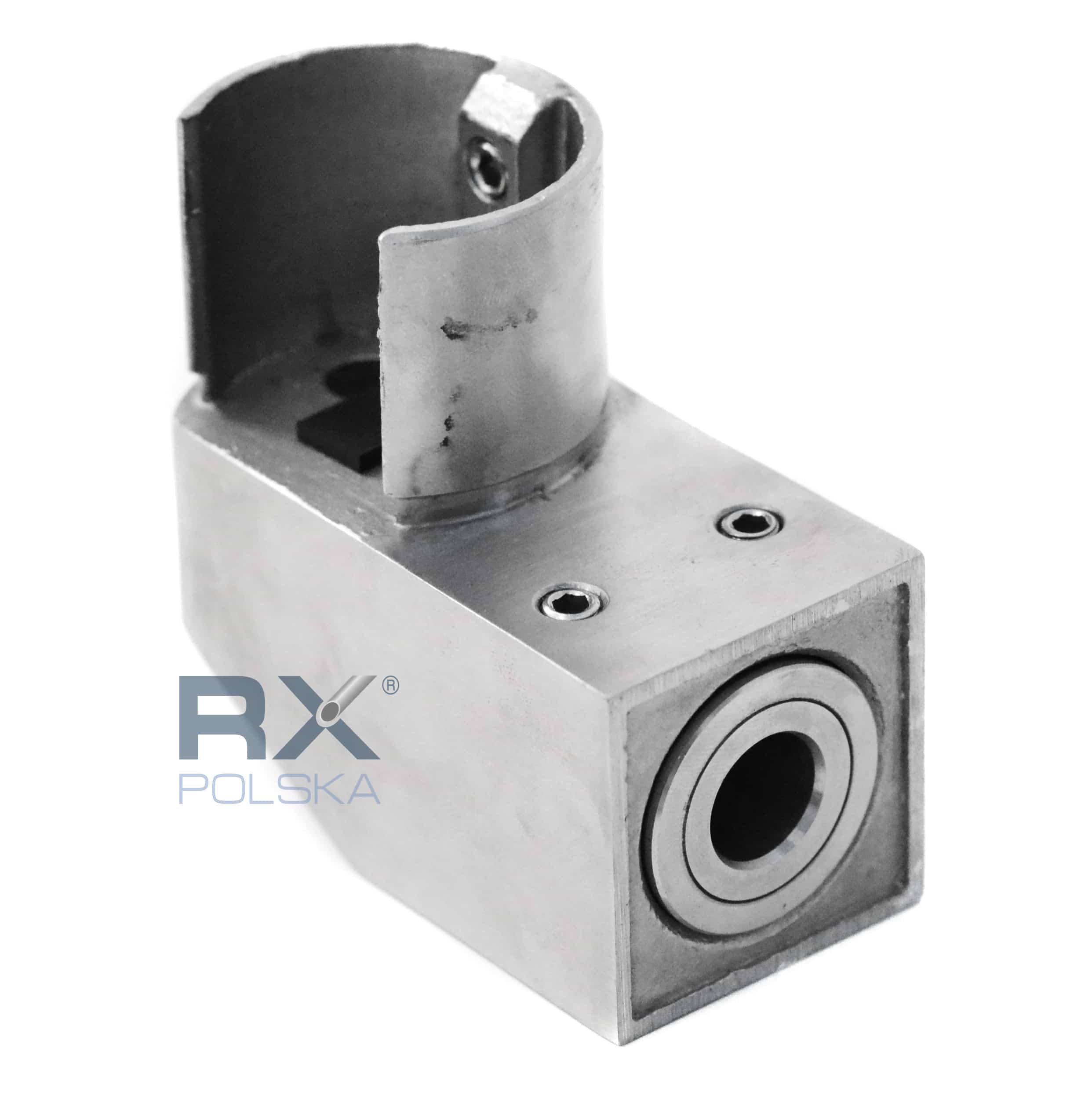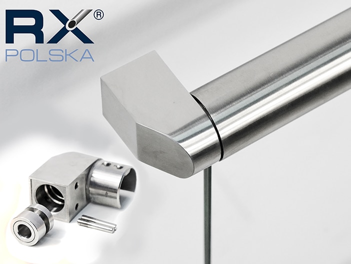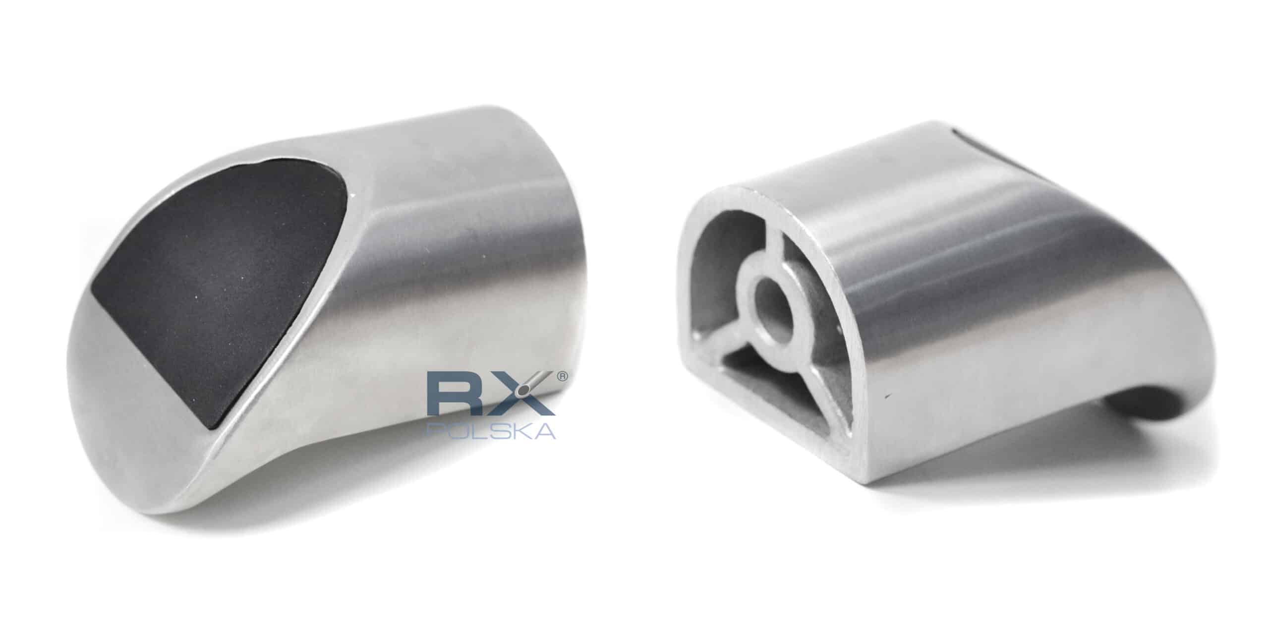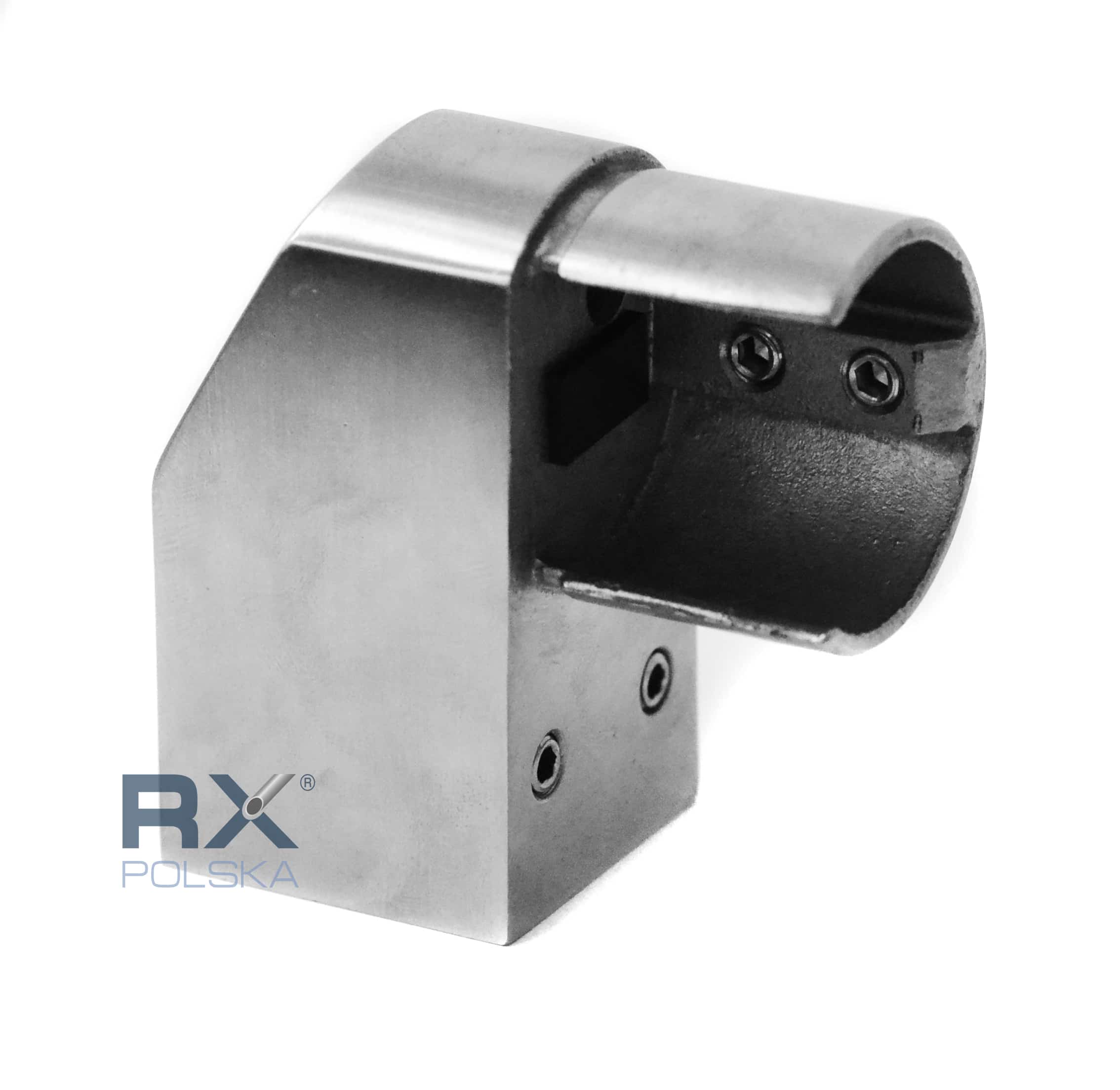 - Hoveddelen av festet (laget av en stålstøping) har i seg selv en flens for å feste rekkverket på glasset og hullet for å koble til hylsen